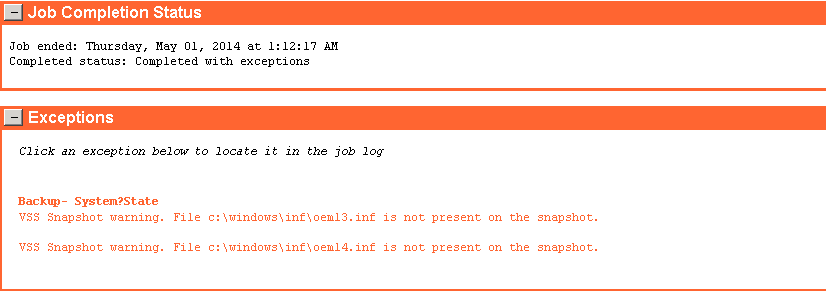 I recently was given this error in a backup that was leveraging Symantec Backup Exec 2010 R2. I noticed that it wasn’t failing but was “Completing with Exceptions”. Upon investigation of the job log I found the errors above, and below.