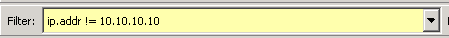 “ip.addr != 10.10.10.10” that should show you everything except for packets with the IP addrress 10.10.10.10. The problem is … it doesn’t work. It turns yellow like this, and doesn’t filter that IP.