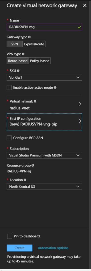 The Azure VPN Gateway is just about as easy as it gets to configure and to managed (sometimes to a fault). The only caveat you need to be aware of in this scenerio, is that RADIUS Point-to-Site authentication is only available on the SKU “VPNGW1” and above. You’ll then need to choose the vnet where you have created the VPN Gateway, and create a Public IP Address resource.