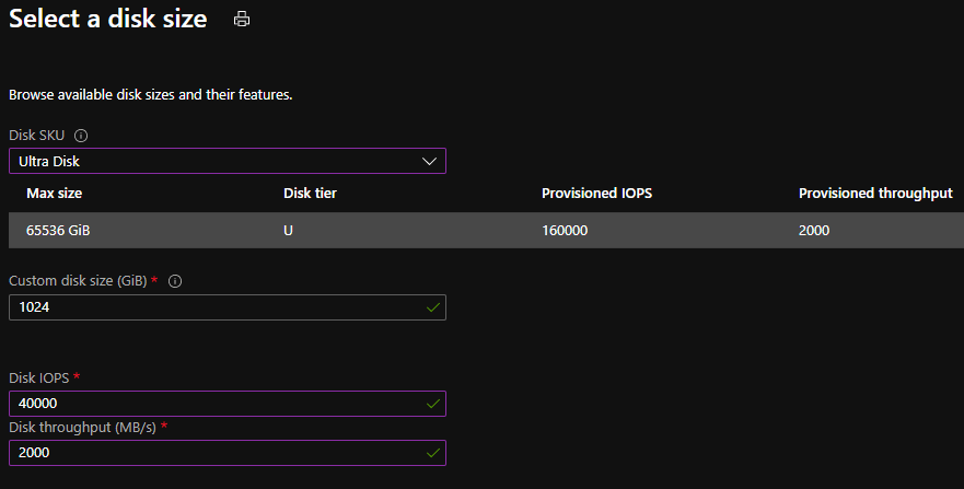 Unlike with the other disk types, this configuration allows you to select your disk size and performance (IOPS AND Throughput) independently! I recently worked on a design where the customer needed 60,000 IOPS, but only needed a few TB of capacity, this is the perfect scenario for Ultra Disks. They were actually able to get more performance, for less cost compared to using Premium SSDs.