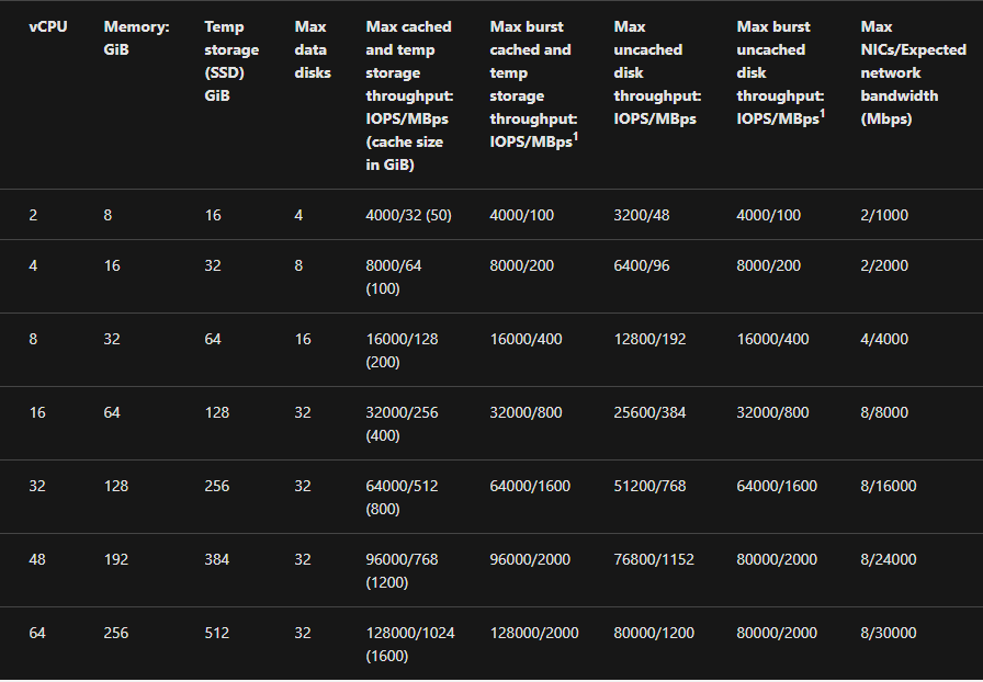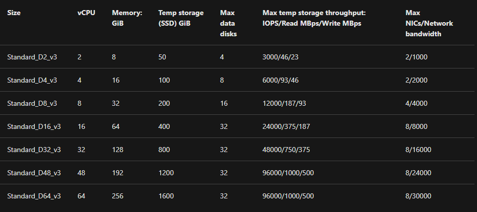While it may not seem vitally important, the VM SKU you choose can impact your ability to provide storage capabilities in areas such as Disk Type, Capacity, IOPS, or Network Throughput. You can view the list of VM SKUs available on Azure at this link. As an example, I’ve clicked into the General Purpose, Dv3/Dvs3 series and you can see there are two tables that show upper limits of the SKUs in that family.