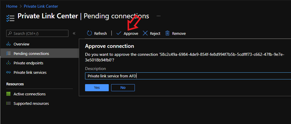 Once Azure Front Door is done deploying, you will need to open up the Private Link Center. From there you will navigate to the “pending connections”, which is where you will see the connection request from Azure Front Door with the message you may or may not have customized. Remember that Azure Front Door uses Azure Private Link Service to connect it’s own managed Private Link Service to your Web App. You will need to “Authorize” the connection request in order for the connection to be created and allow Front Door to privately communicate with your Web App.