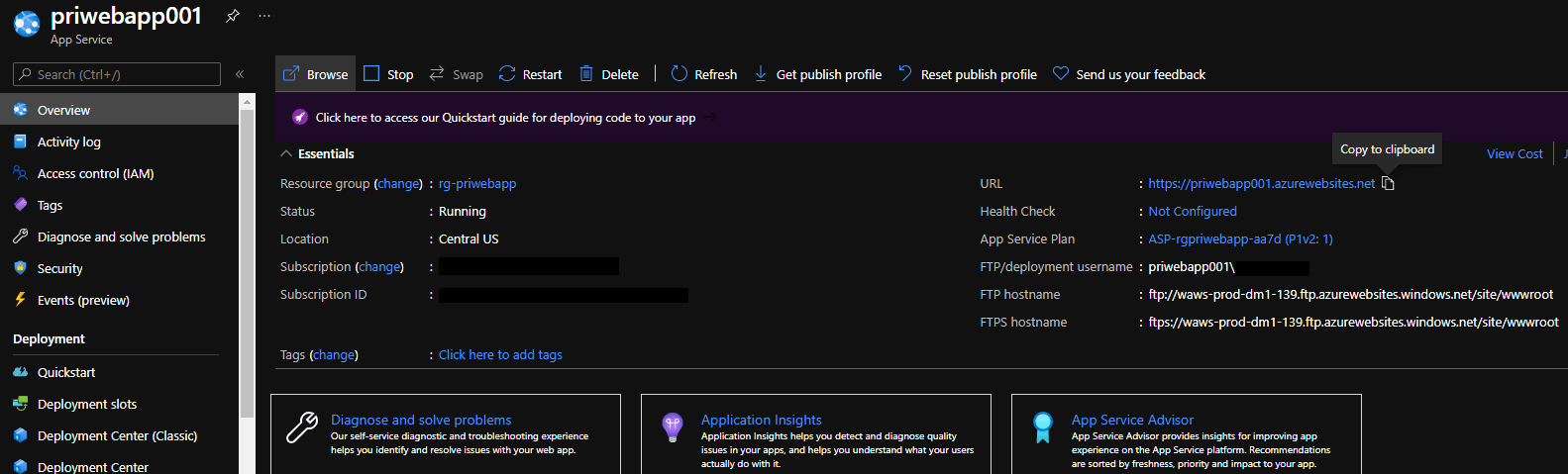 Once the Web App is deployed, you’ll need the URL of the website and want to test it in a web browser. In this instance I’m not hosting anything in particular, simply hosting the sample page to show that it’s working.